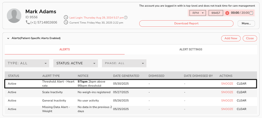 Here we can see an example of the Per-Patient alert we created triggered when exceeding 97bpm when the Clinic-Wide alert was set for 100bpm being exceeded.