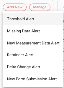 There are multiple alert types for different use cases. Here is a quick summary of each:- Threshold Alert - This alert can be configured to be activated based on a data type, an upper or lower limit, and a refresh period.