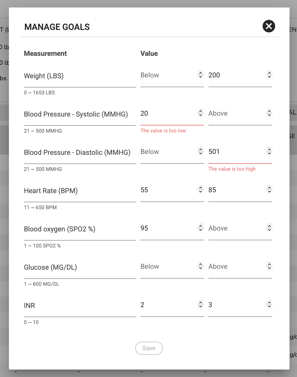 Below are example goals based on the available measurements in the table. There are three ways to set a goal based on a BELOW, ABOVE, or TARGET RANGE. Examples are numbered in succession:- For Weight, we've only set an ABOVE value of 200lbs. This means that the measurement will show in range if the patient measures below 200lbs.