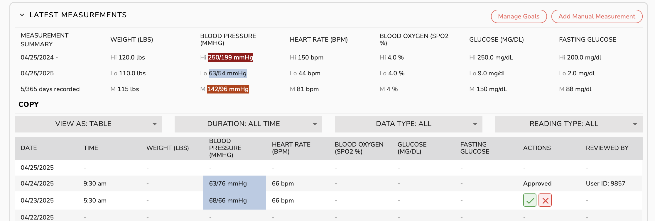 Patients can now have goals set to provide visual indicators when reviewing the Patient Chart Measurement table.